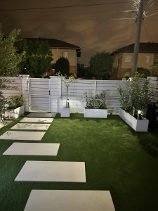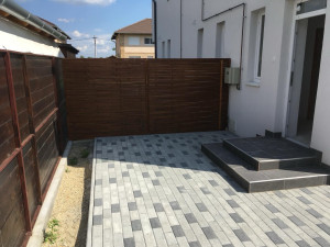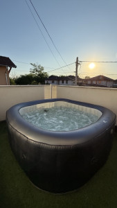 A hatalmas méretű teraszon a virágok és kerti bútor szett mellett kényelmesen elfér a jakuzzi is. A teraszon elektromos sötétítő rendszer lett kiépítve hangulatvilágítással (ennek ára 10 millió Ft újonnan).