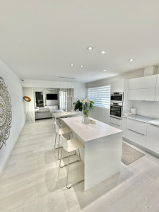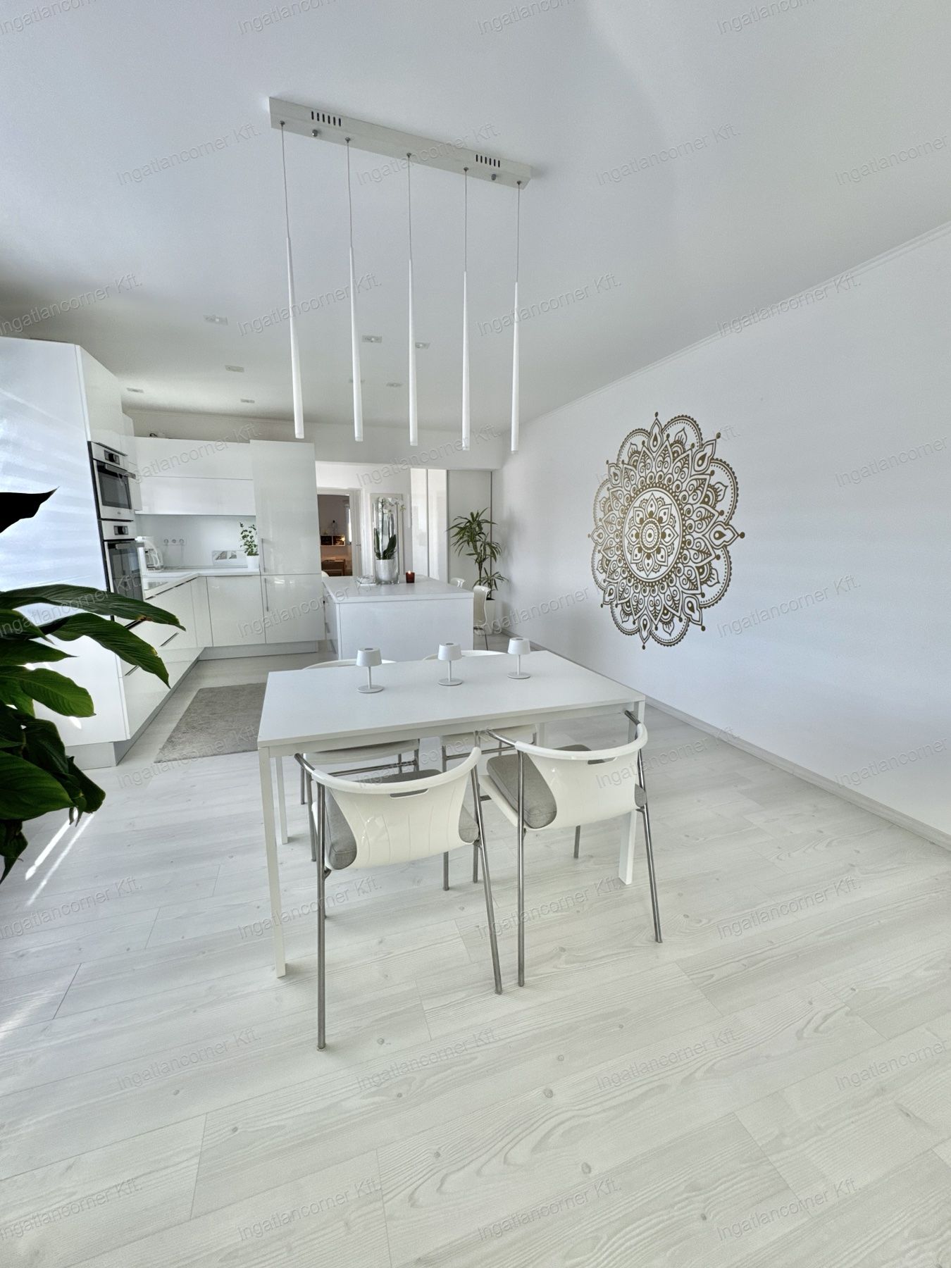 A nappali ragyogóan világos. Nagyon alacsony rezsi! Az elegáns konyha egyedileg tervezett, gépesített. Okos lámpák.