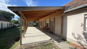 A ház előterében tágas, fedett terasz várja az új lakókat – ideális hely a reggeli kávéhoz vagy a nyári családi vacsorákhoz. A terasz mérete lehetővé teszi akár 2-3 autó kényelmes beállását is.
