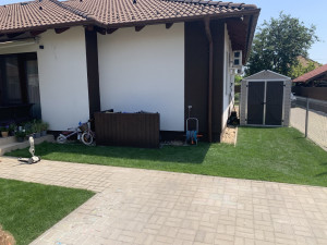 Elrendezését tekintve kiváló: előszoba, 3 háló szoba, fürdőszoba káddal + WC-vel, am-konyhás jó méretű nappali, külön WC, mosókonyha, plusz a nappaliból kilépve 14 nm-es fedett TERASZ kapott helyet . A padlástér is pakolható. Előkertben 1 autó számára térkövezett, fedett KOCSIBEÁLLÓ, a ház előtt több autó számára parkolási lehetőség. A kertben kerti csap és zárható tároló. Nappaliból a kertre nyíló kilátás.