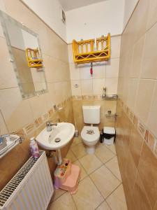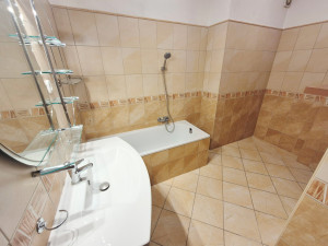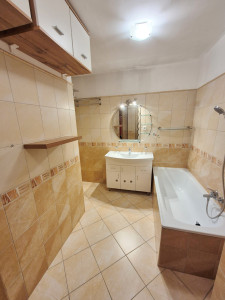 Majd a sort a külön mellékhelyiség és a nagyméretű káddal felszerelt fürdőszoba zárja, ahol igény esetén egy plusz zuhanyzó is kialakítható, jelenleg beépített mosdószekrény és felső szekrények is elérhetőek és a mosó-szárítógép is könnyen elhelyezhető a méretének köszönhetően.